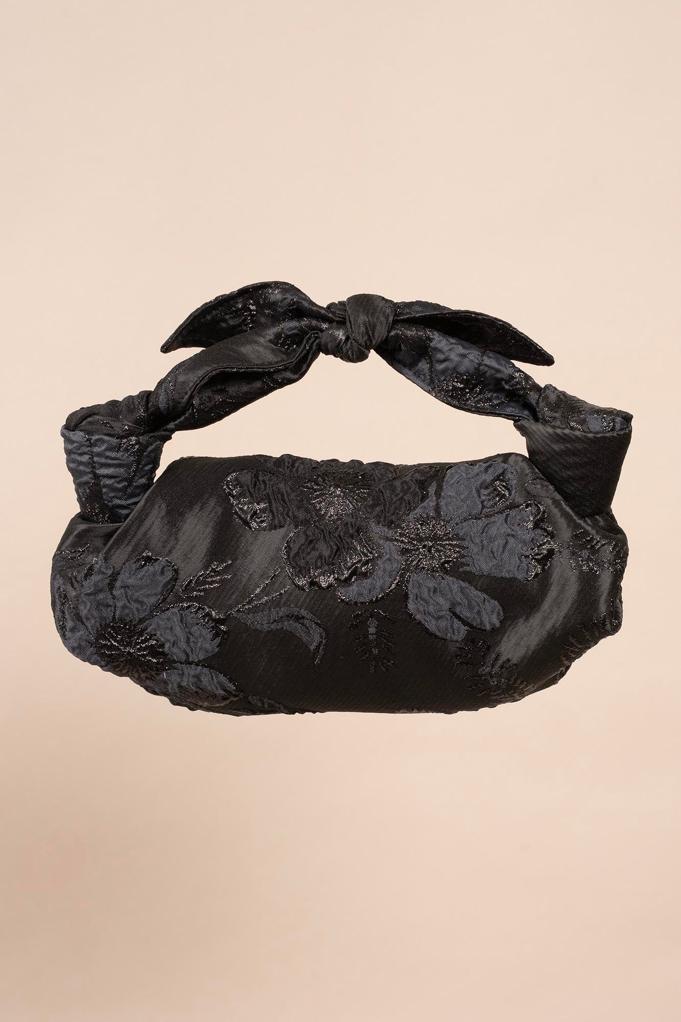 A black & navy metallic shimmer tiny satin brocade handbag inspired by the Furoshiki Japanese technique of wrapping with fabric. Perfect for parties.