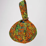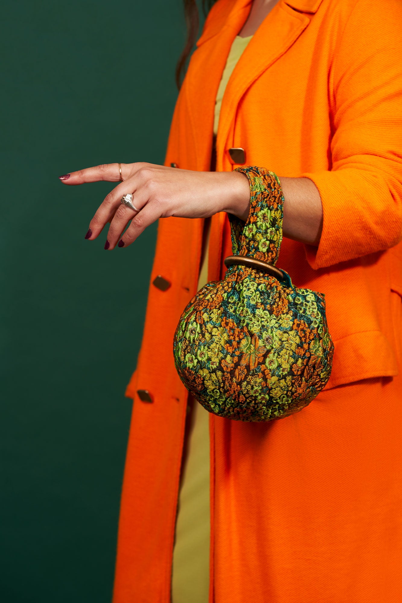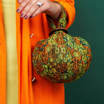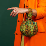 A multicolored metallic brocade mini clutch inspired by the shape of a chickpea ("cece" in Italian). Featuring wooden ring hardware. Fully lined with teal matte satin.