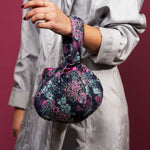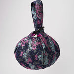 A multicolored metallic brocade mini clutch bag inspired by the shape of a chickpea ("cece" in Italian). Featuring a wooden ring hardware and fully lined with fuchsia matte satin.