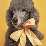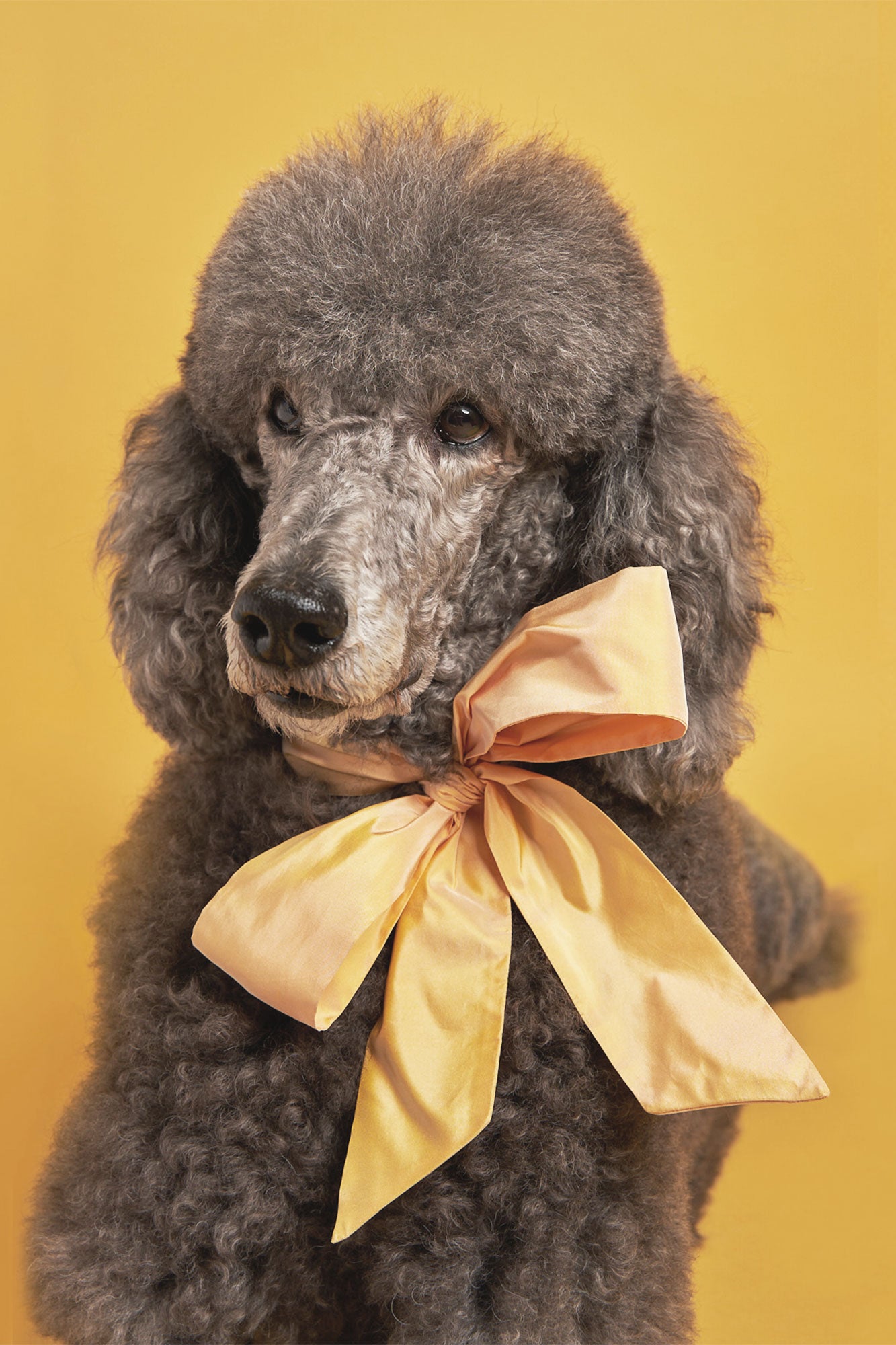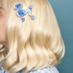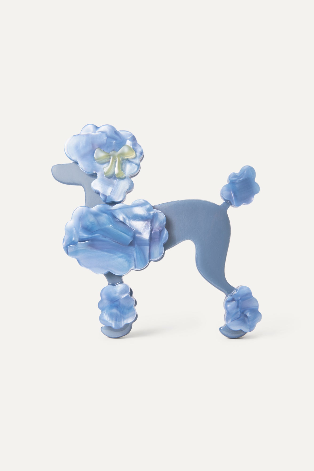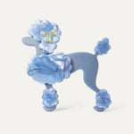 A statement hair clip designed in the profile of MLE's regal rescue standard poodle Hazel, with pastel blues and a pale yellow bow.
