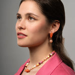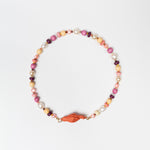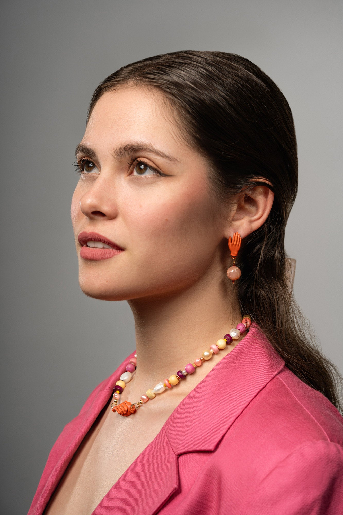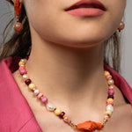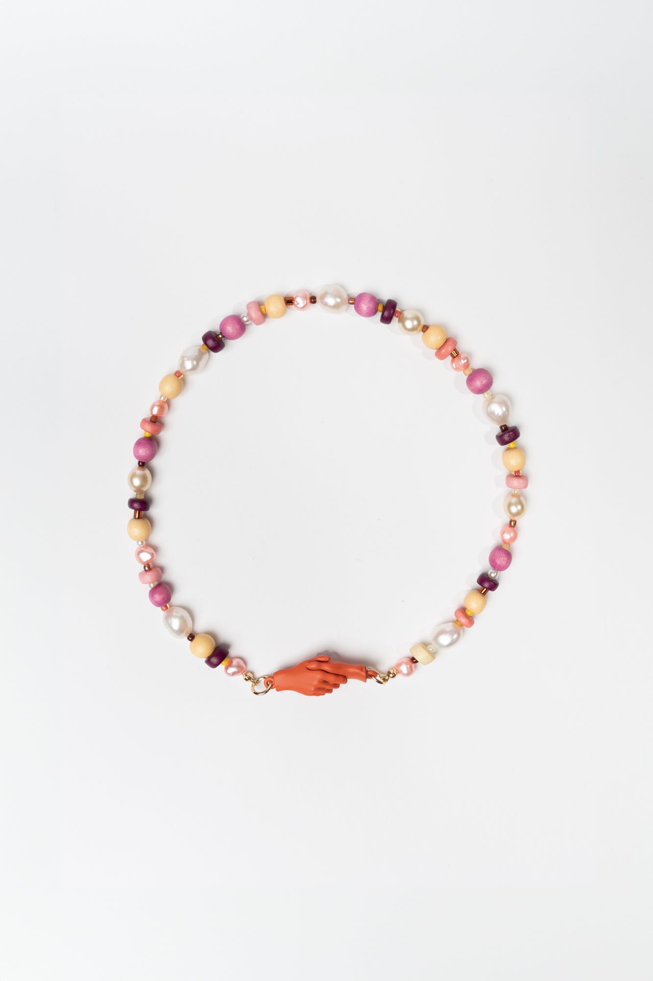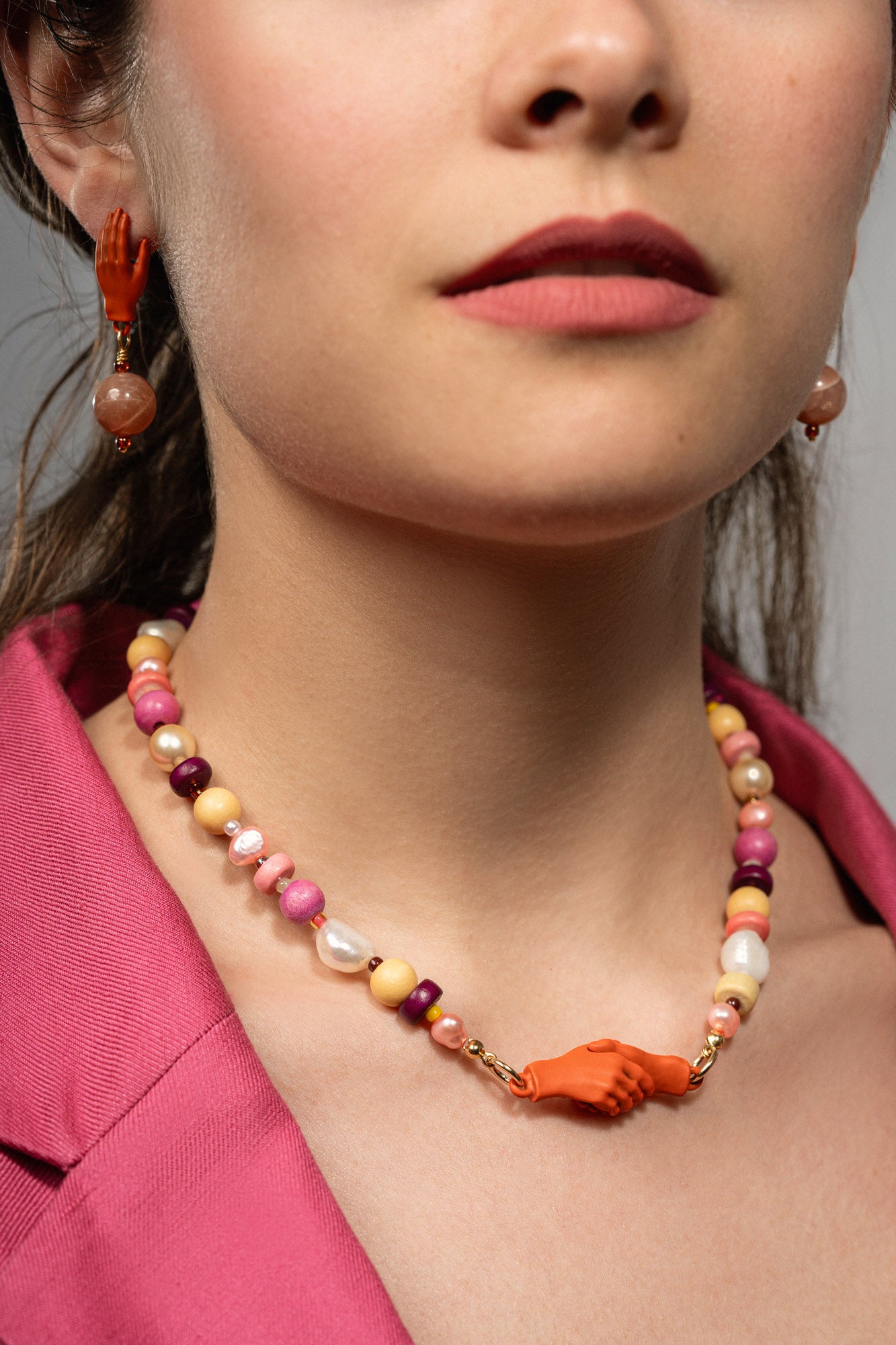 A limited edition piece featuring our signature magnetic handshake clasp in a bold orange, thoughtfully paired with wood, glass, and pearl beads in complementary tones.