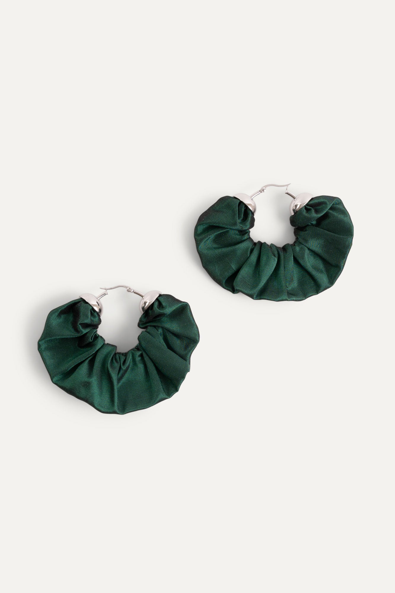 A charming set of lightweight hoops that make a statement. Sustainably handcrafted with our finest remnant fabric from production. Featuring forest green silk taffeta for a radiant glow.