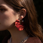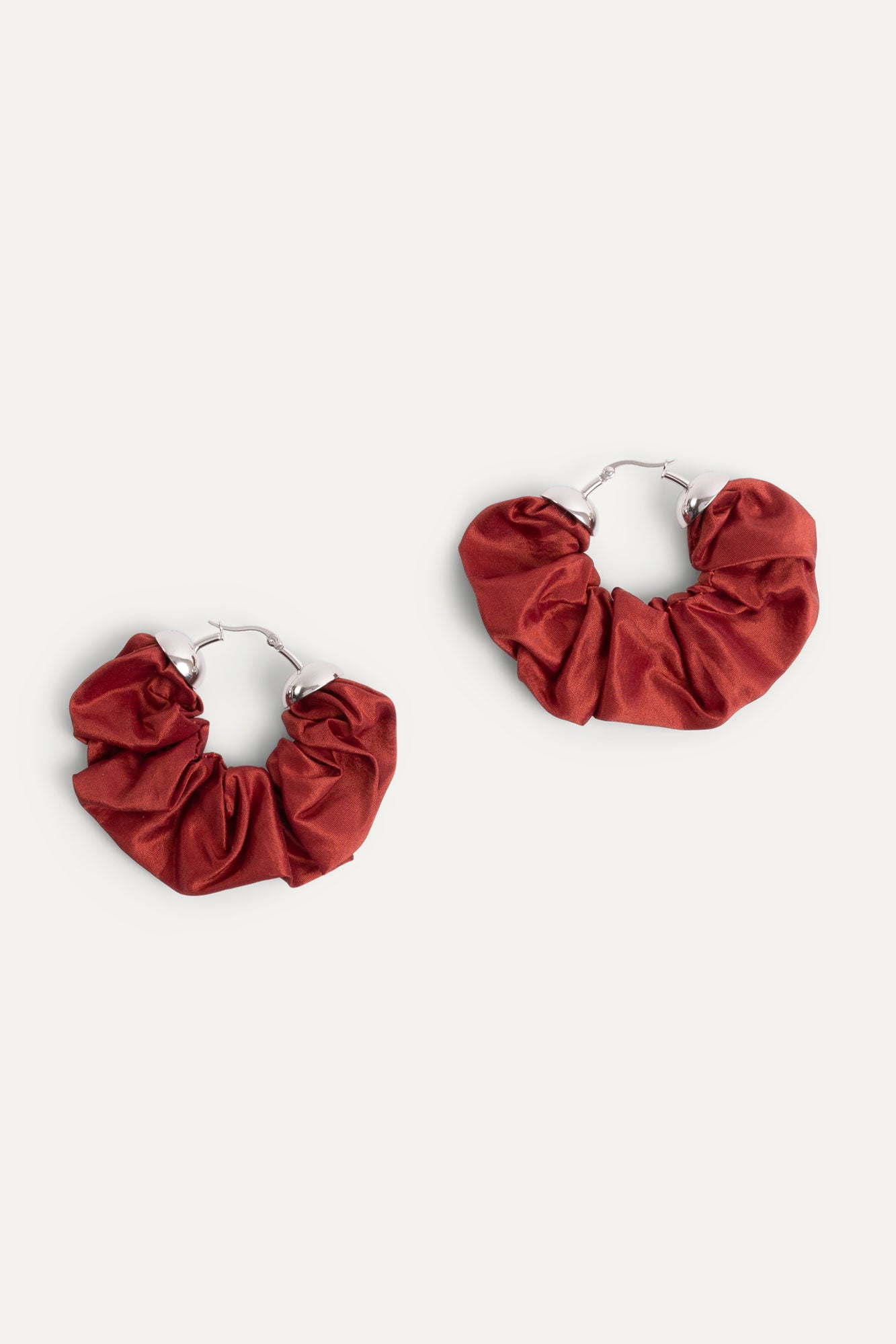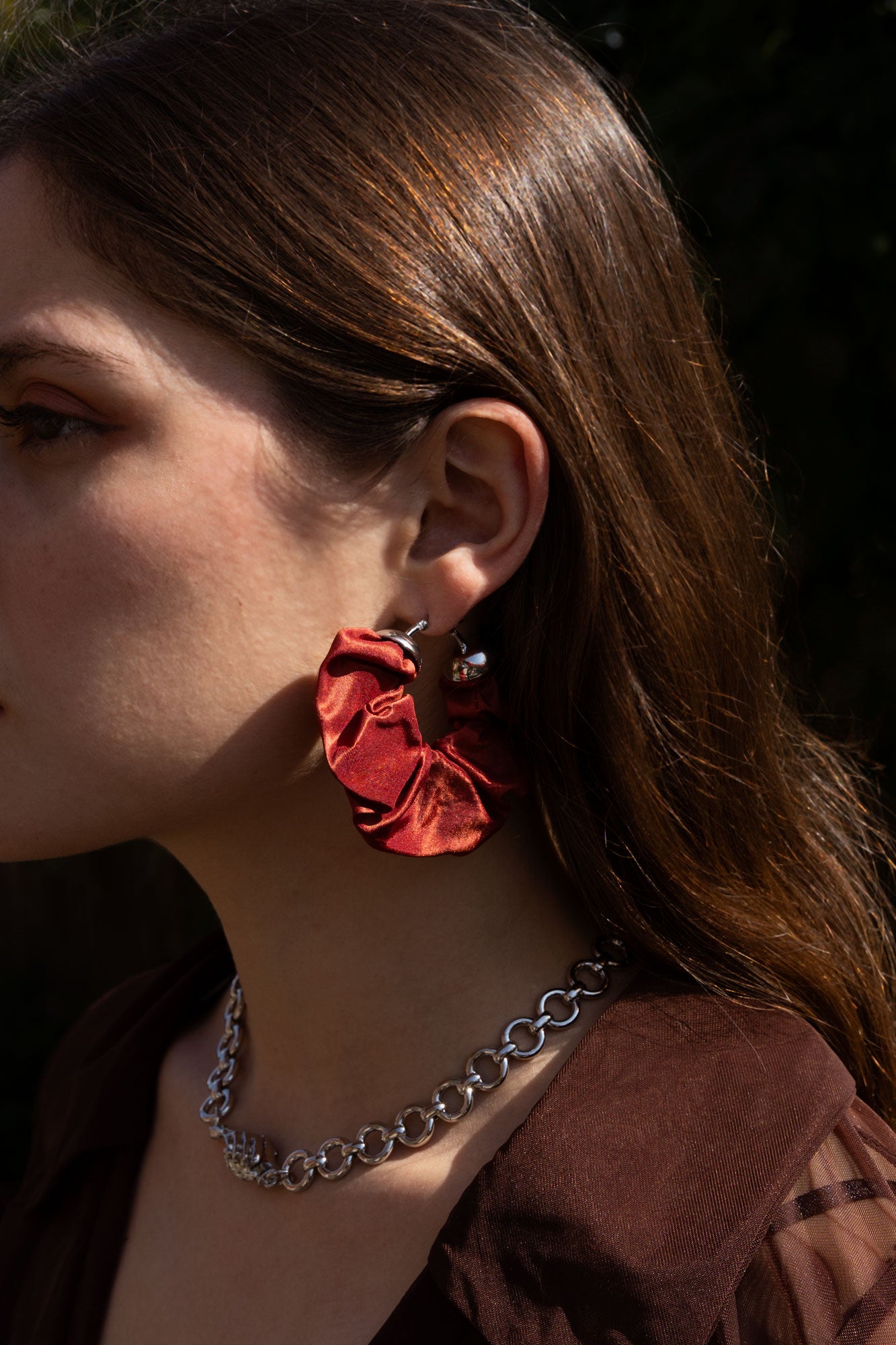 A charming set of lightweight hoops that make a statement. Sustainably handcrafted with our finest remnant fabrics from production. Featuring rust toned silk taffeta for a radiant glow.