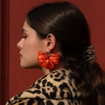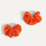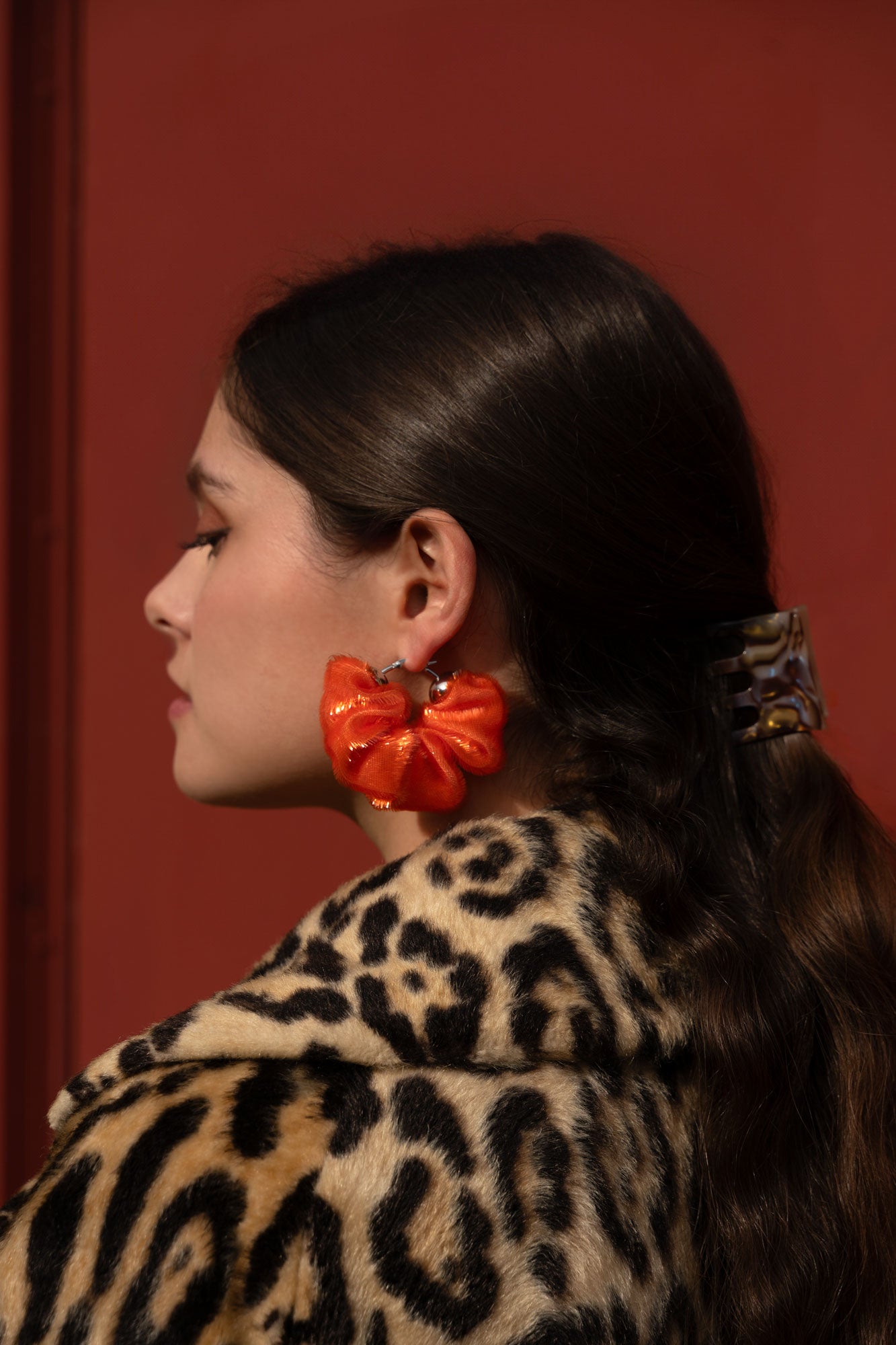 A charming set of lightweight hoops that make a statement. Sustainably handcrafted with our finest remnant fabrics from production. Featuring orange fluffy textured fabric for a bit of shimmer.