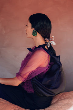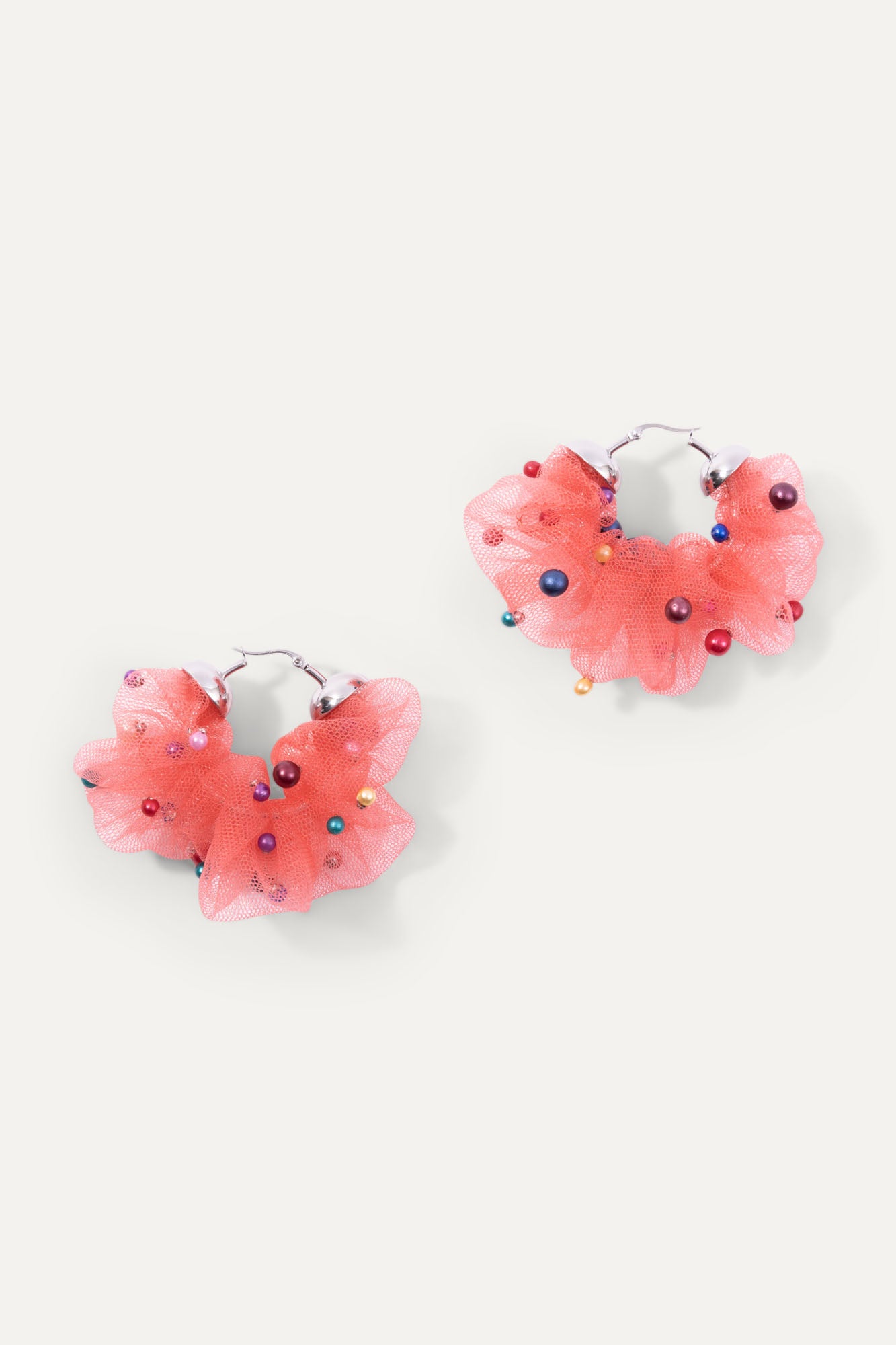 A charming set of lightweight hoops that make a statement. Sustainably handcrafted with our finest remnant fabric from production. Featuring multicolored faux-pearl studs affixed to synthetic coral pink mesh fabric.