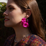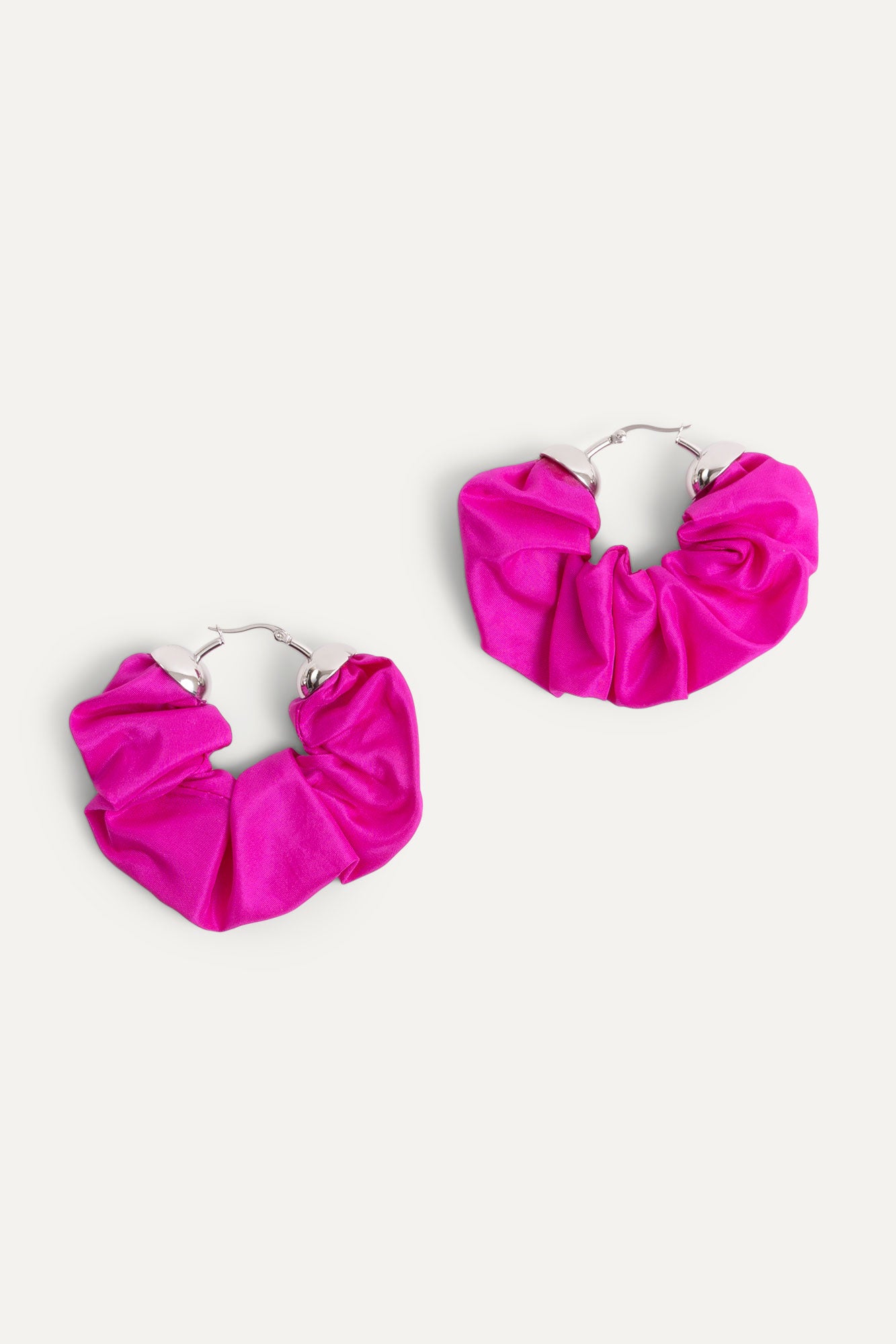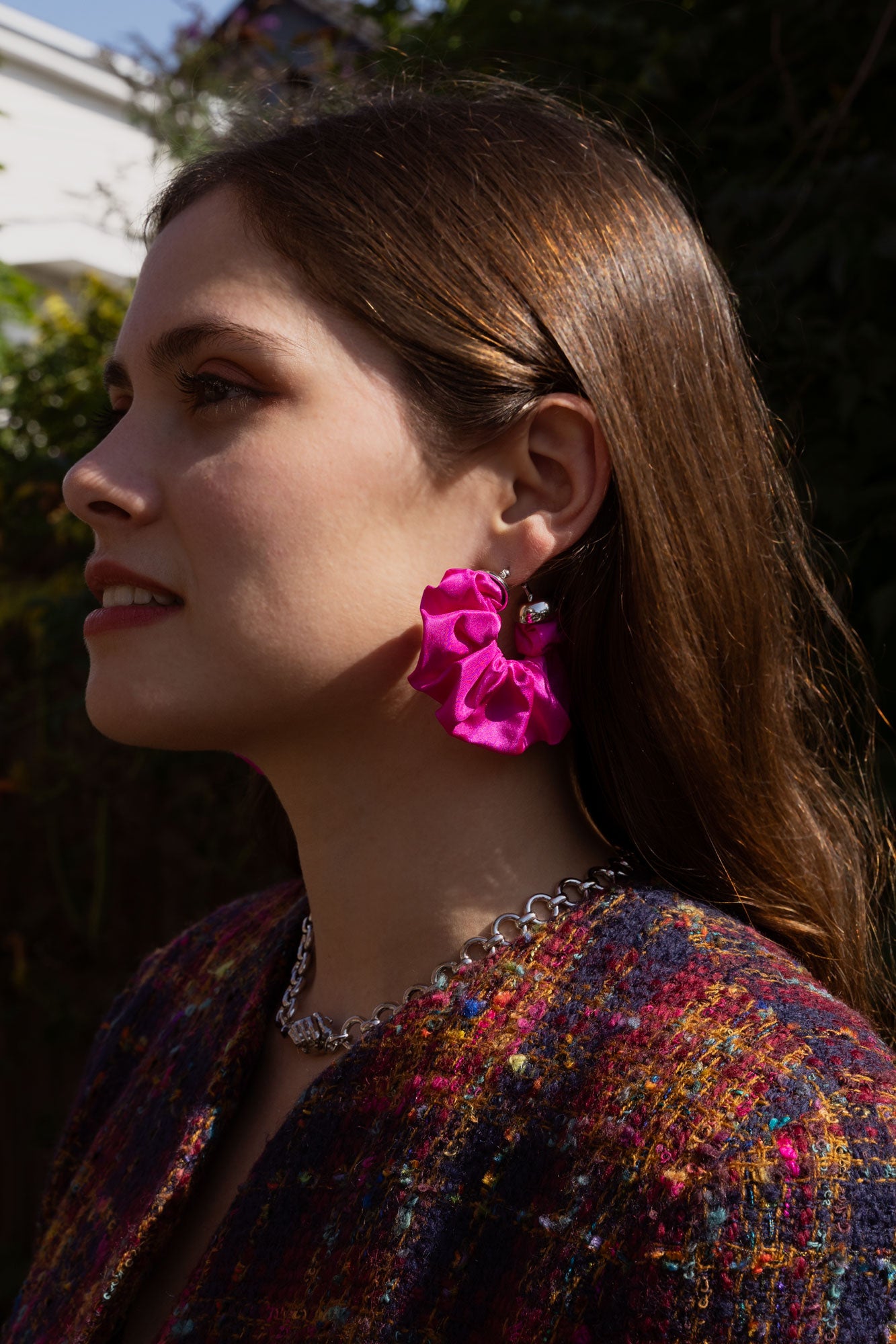 A charming set of lightweight hoops that make a statement. Sustainably handcrafted with our finest remnant fabrics from production. Featuring magenta silk taffeta for a radiant glow.