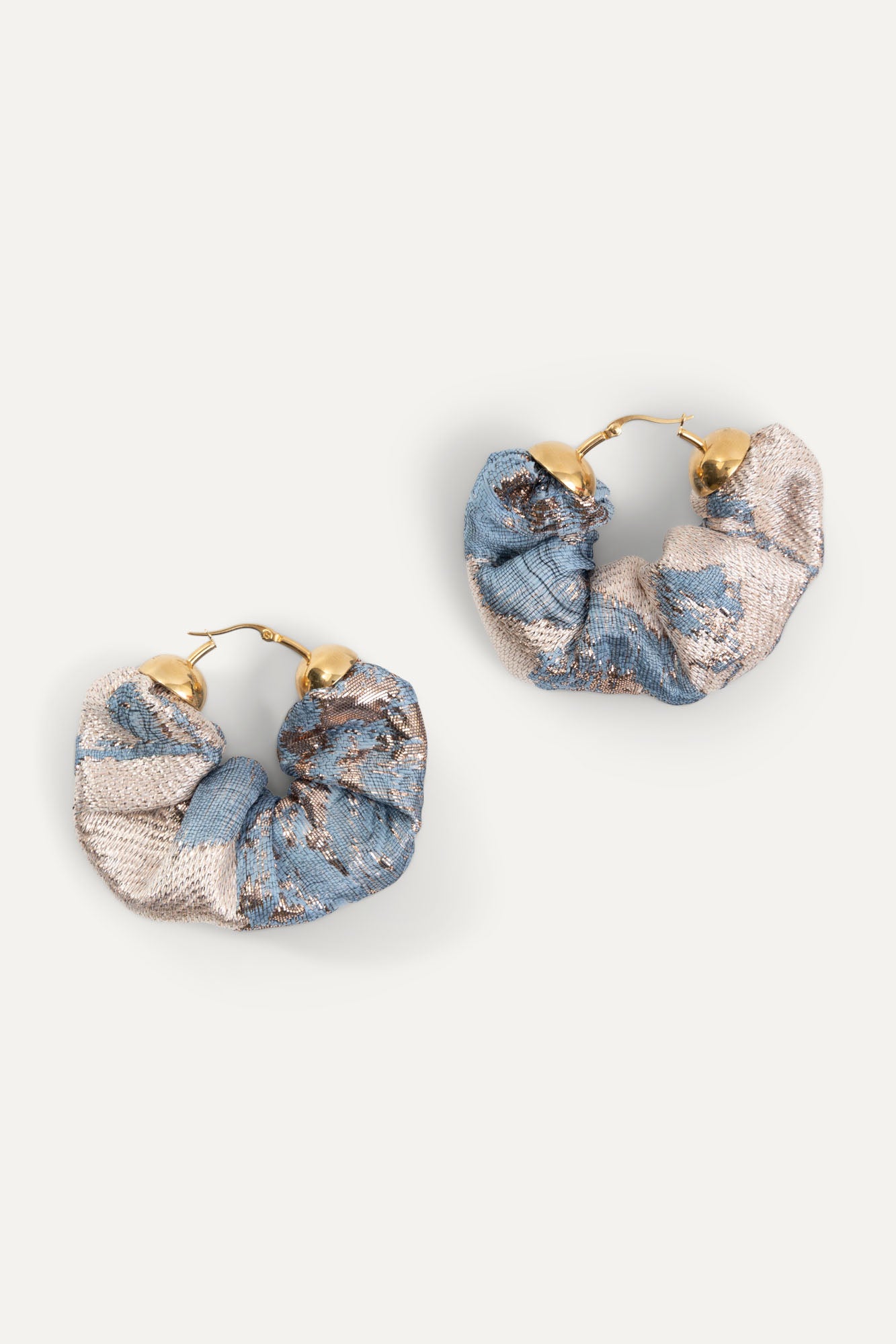 A charming set of lightweight hoops that make a statement. Sustainably handcrafted with our finest remnant fabric from production. Featuring blue and silver metallic brocade fabric.