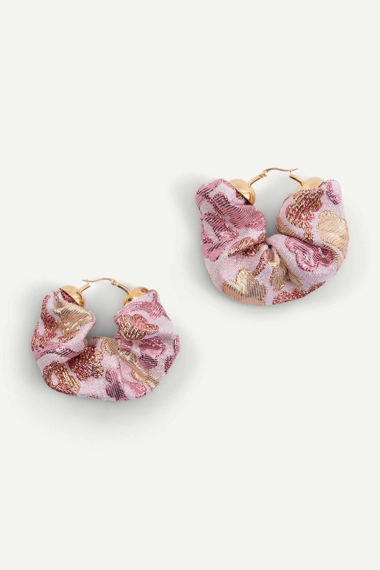 A charming set of lightweight hoops that make a statement. Sustainably handcrafted with our finest remnant fabric from production. Featuring pink and gold metallic brocade fabric.