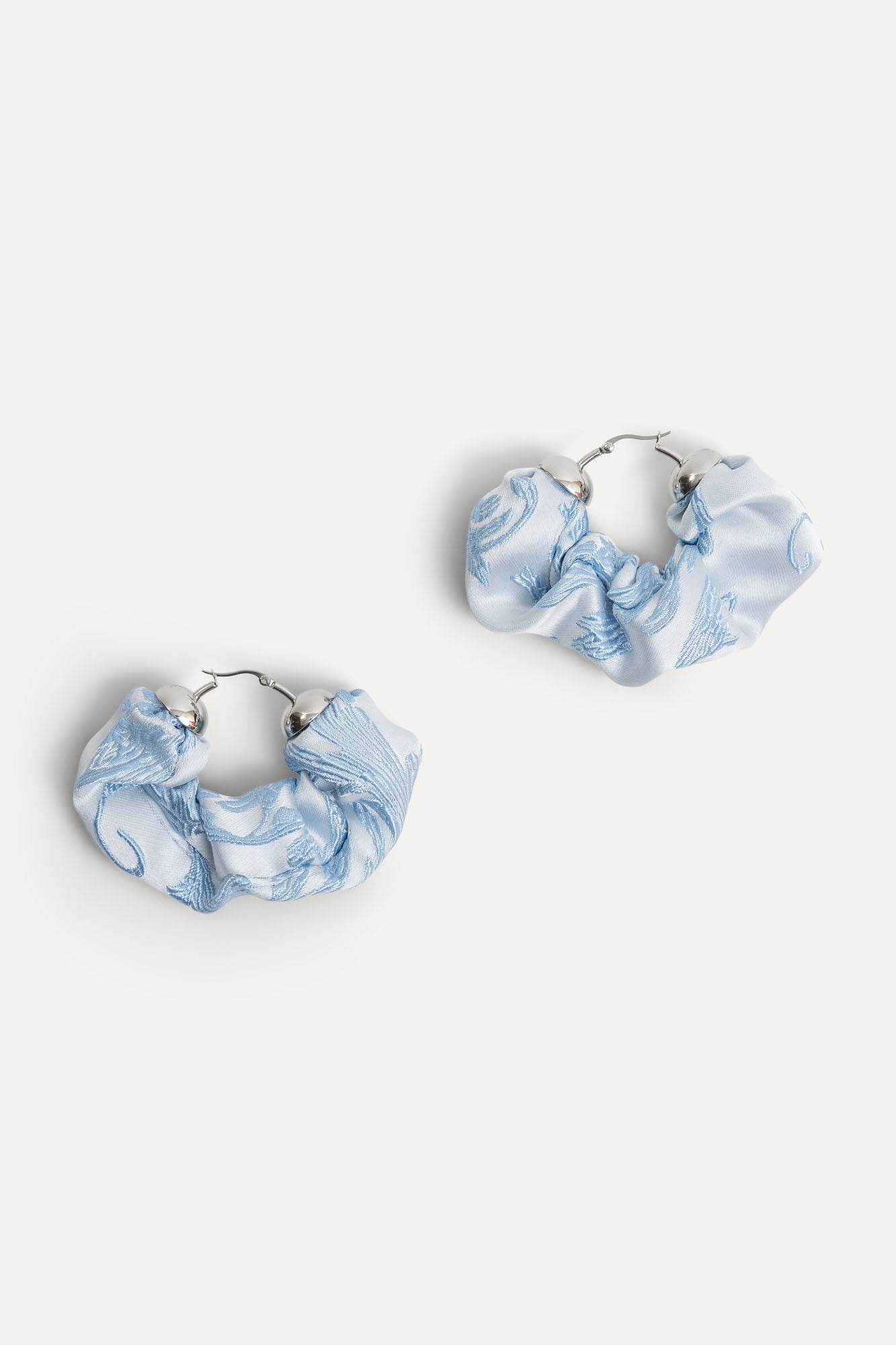 A charming set of lightweight hoops that make a statement. Sustainably handcrafted with our finest remnant fabric from production. Featuring pale blue brocade fabric.