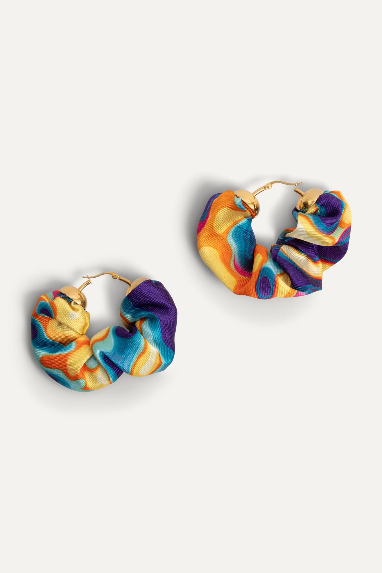 A charming set of lightweight hoops that make a statement. Sustainably handcrafted with our finest remnant fabric from production. Featuring multicolored mikado fabric.