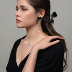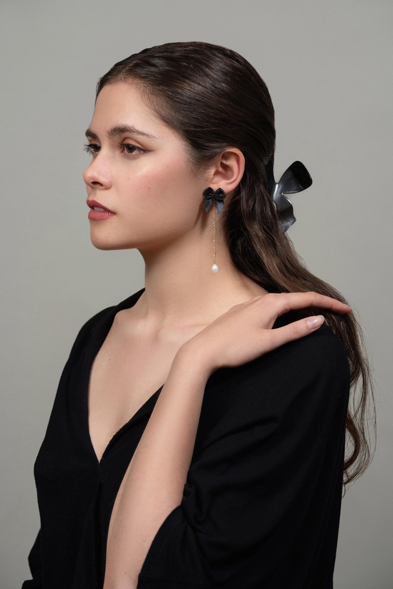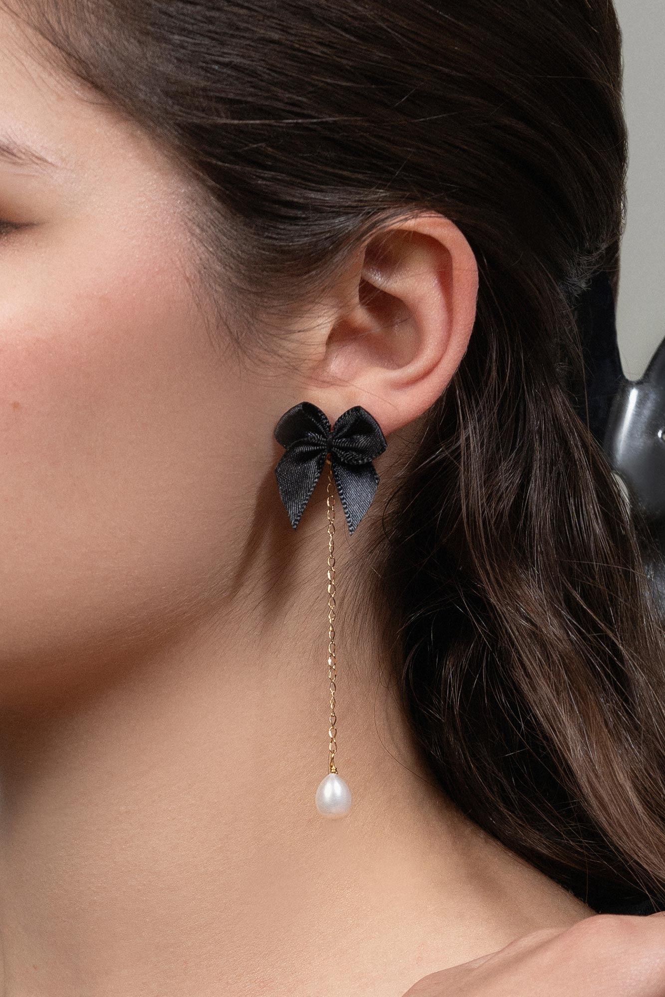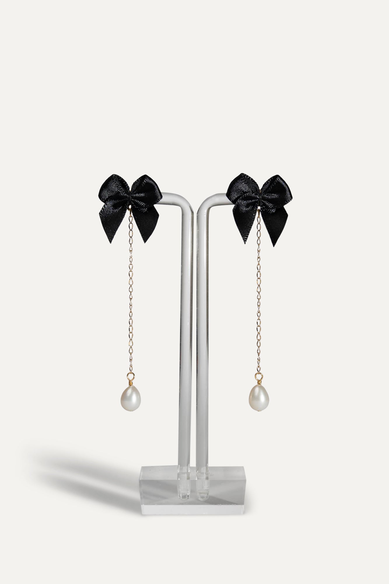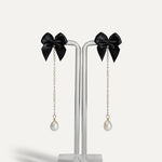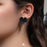 A feminine & refined pair of satin bow earrings in black, featuring a gold chain dangle and genuine teardrop shaped pearls. Handcrafted with fabric, these lightweight studs add a touch of elegance to any look.
