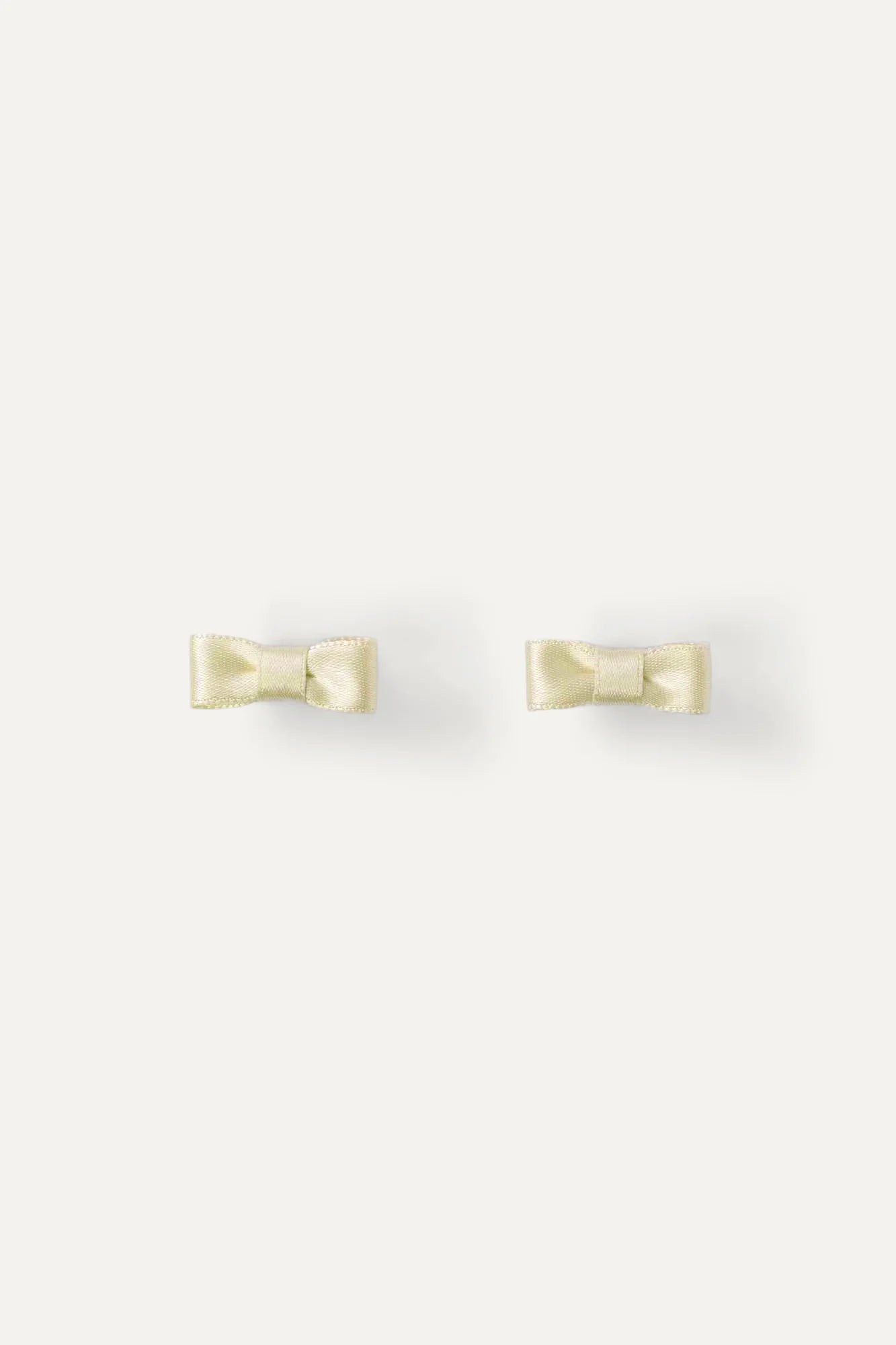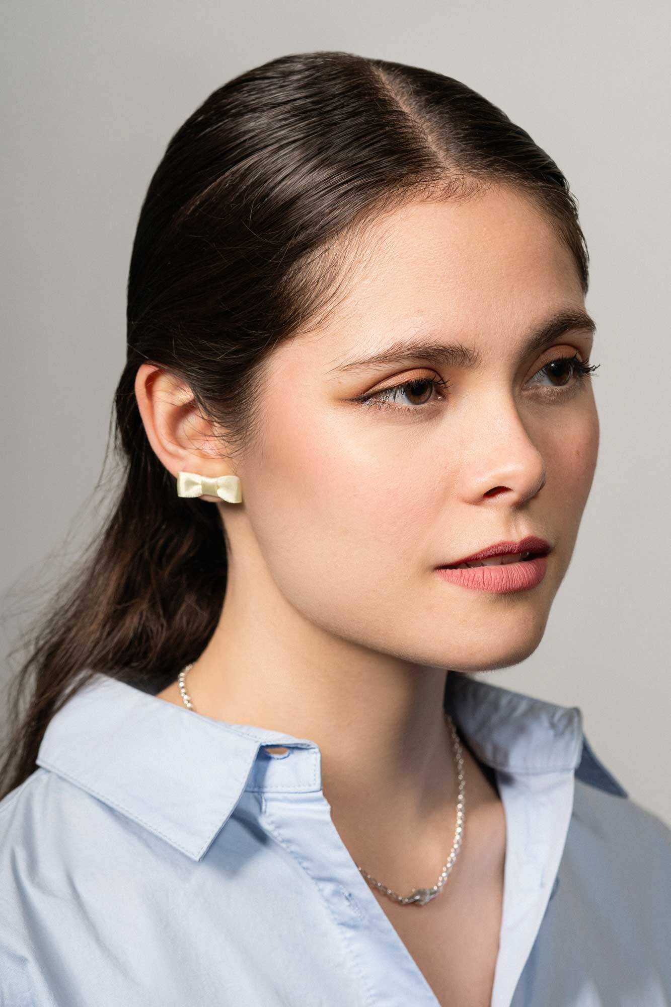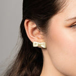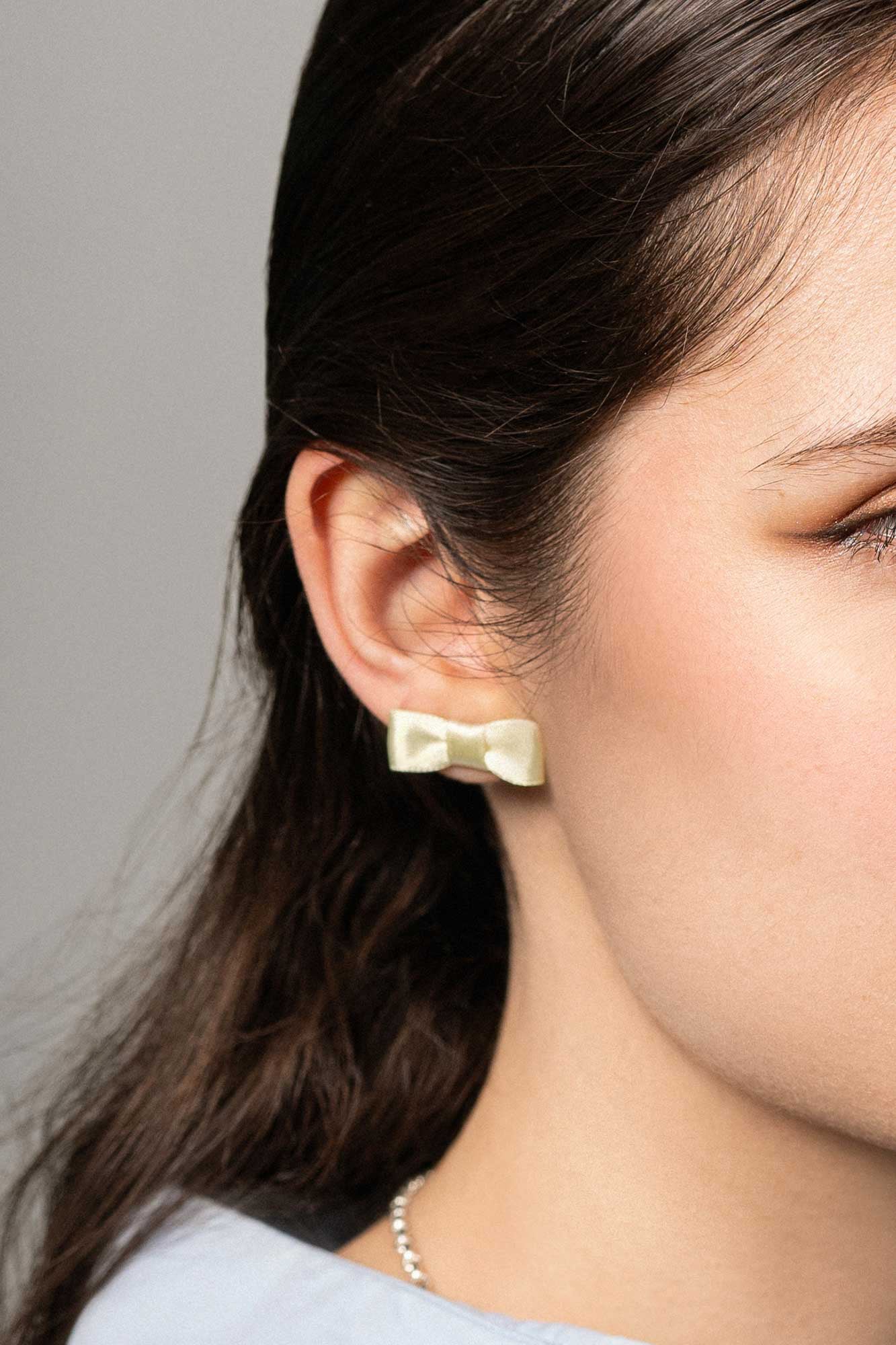 A coquette pair of satin bow earrings in pale yellow. Handcrafted with fabric, these lightweight studs add a touch of elegance to any look.