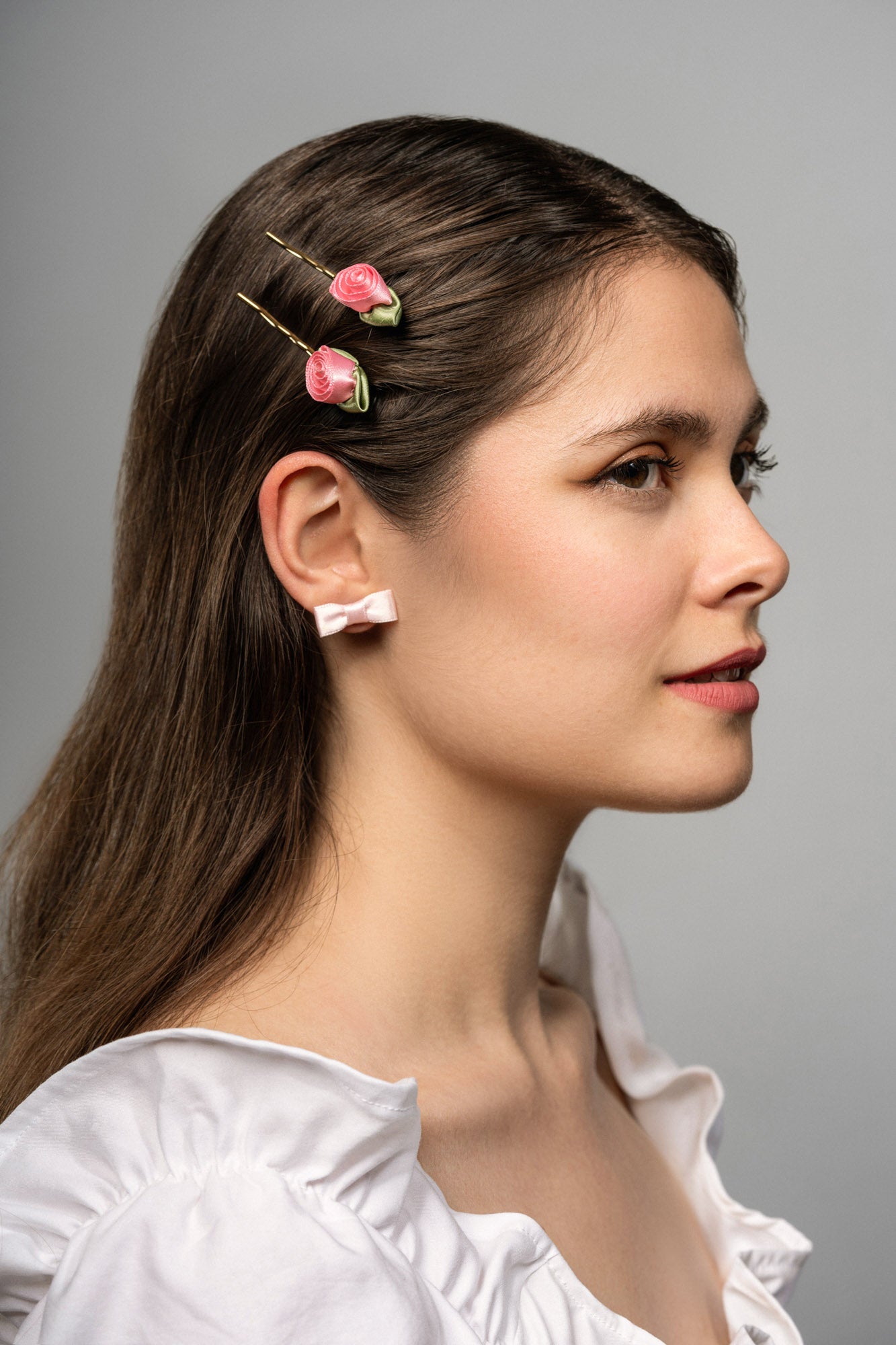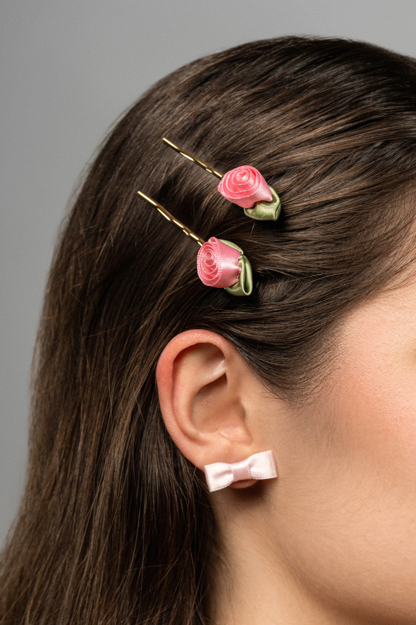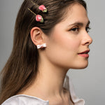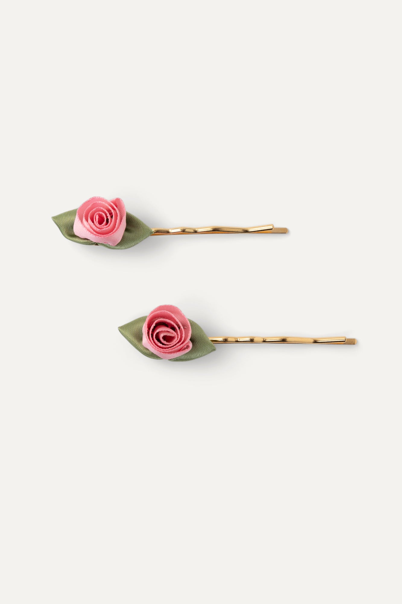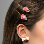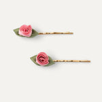 Crafted from satin fabric and plated brass, this set of hair pins features delicate and playful pink roses, adding a touch of whimsy to any hairstyle.