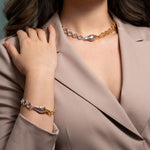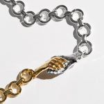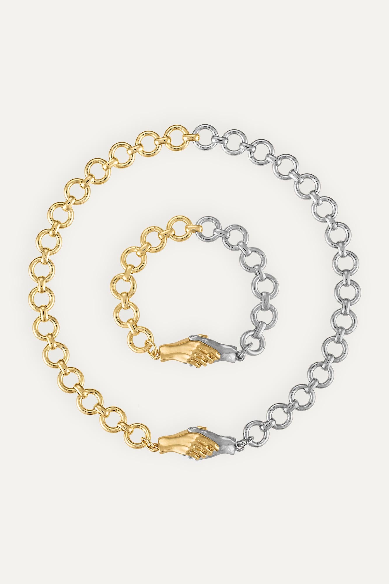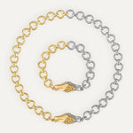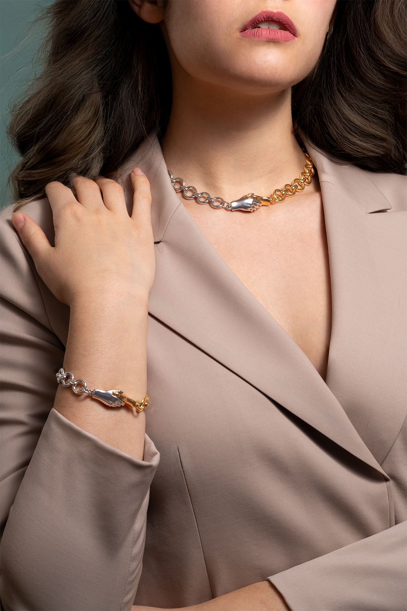 A matching set of our signature necklace and bracelet in a two-tone finish. A symbol of the strength women have when we do things together. Elegant clasped hands seal the deal.