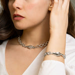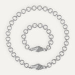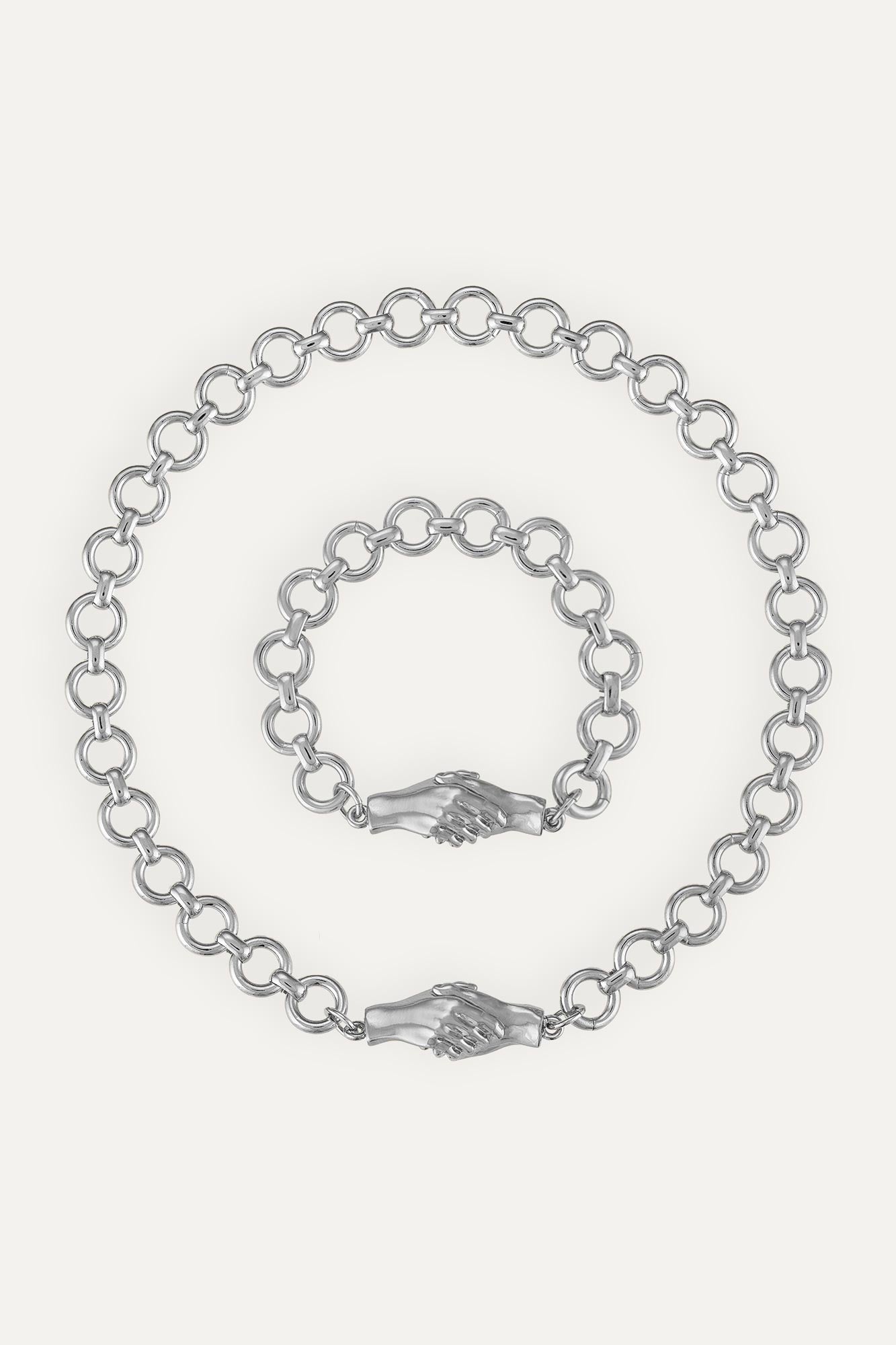 A matching set of our signature necklace and bracelet in a silver tone. A symbol of the strength women have when we do things together. Elegant clasped hands seal the deal.