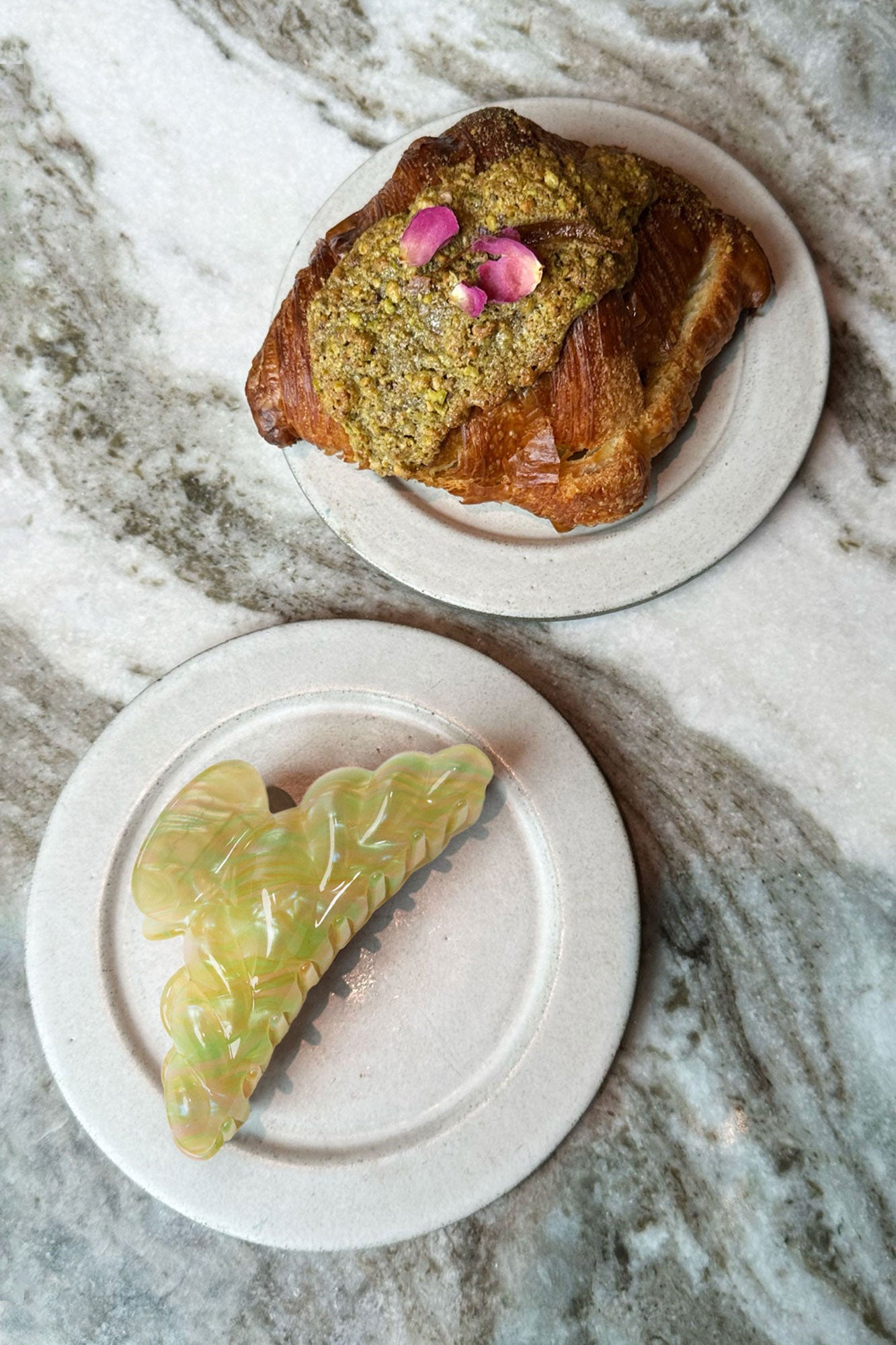Inspired by Librae Bakery's signature Rose Pistachio croissant. Featuring a marbled color palette of marbled green and pink with iridescent gold flecks.