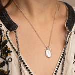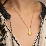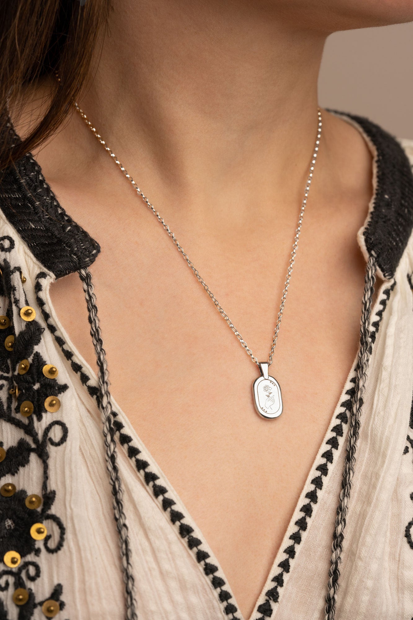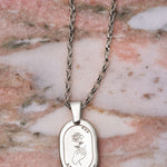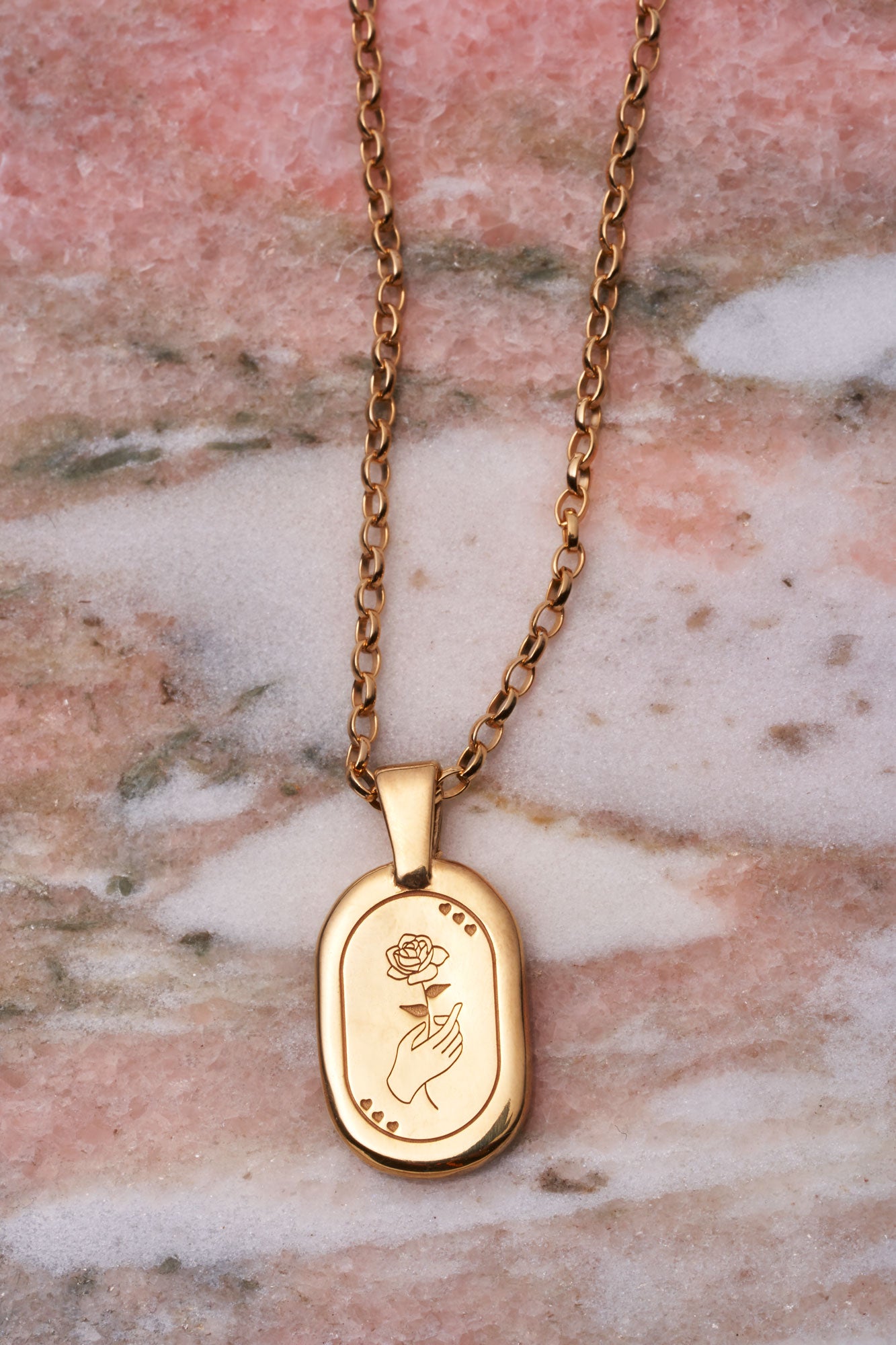 Featuring an engraved rose and hearts- symbols of Aphrodite, the ancient Greek goddess associated with love and beauty, and an elongated rolo style chain.