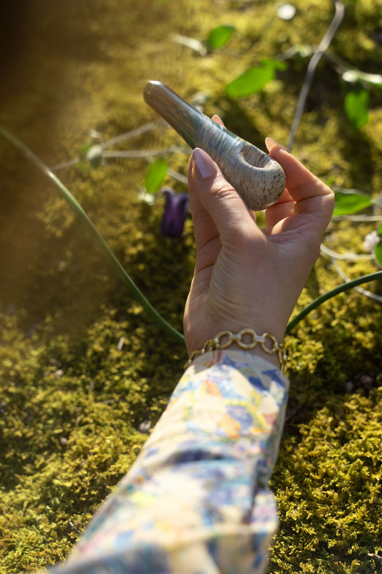 A limited edition piece. Featuring a teardrop shape with a swirl of opaque ecru and transparent grey glass, and a light touch of fumed iridescence.