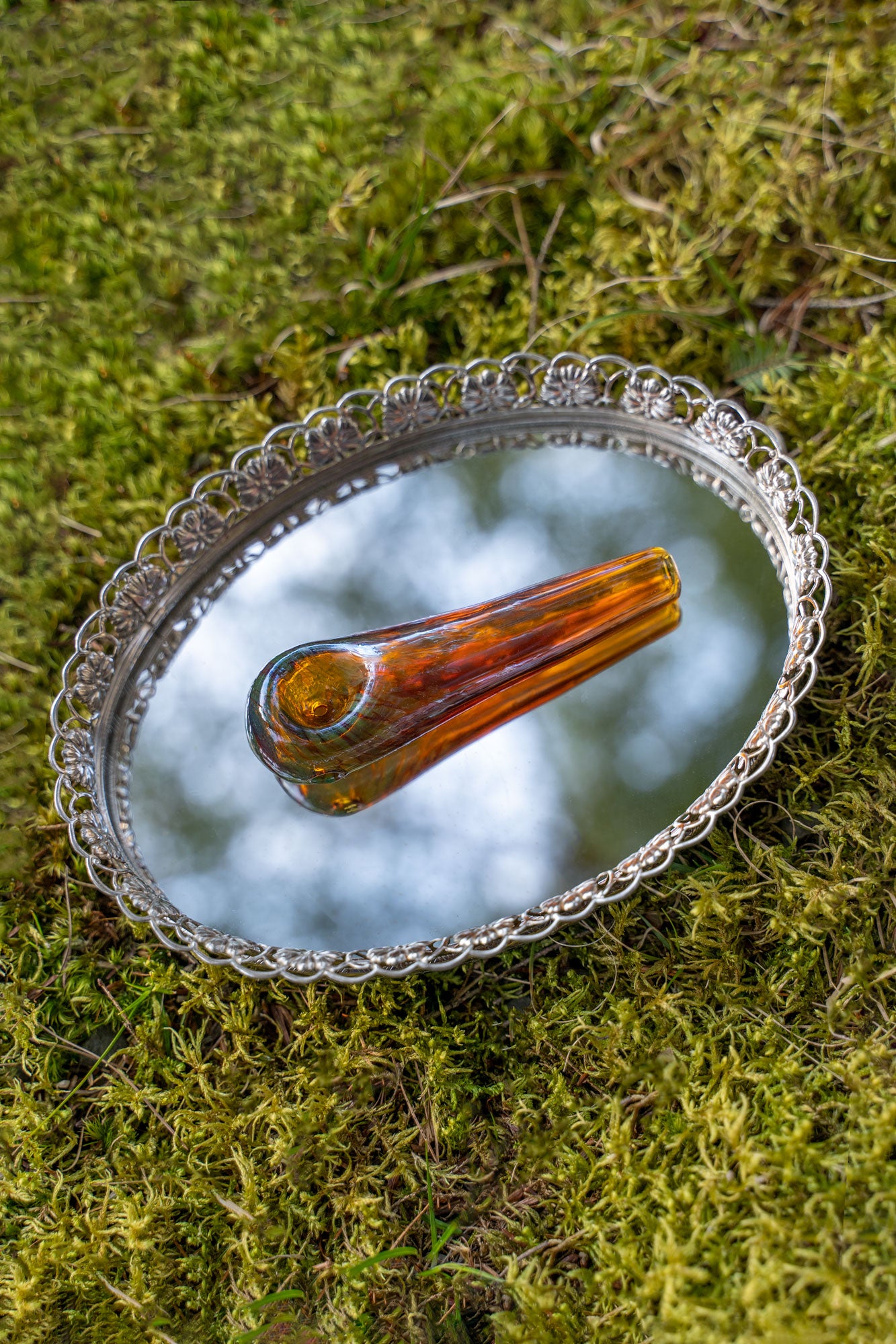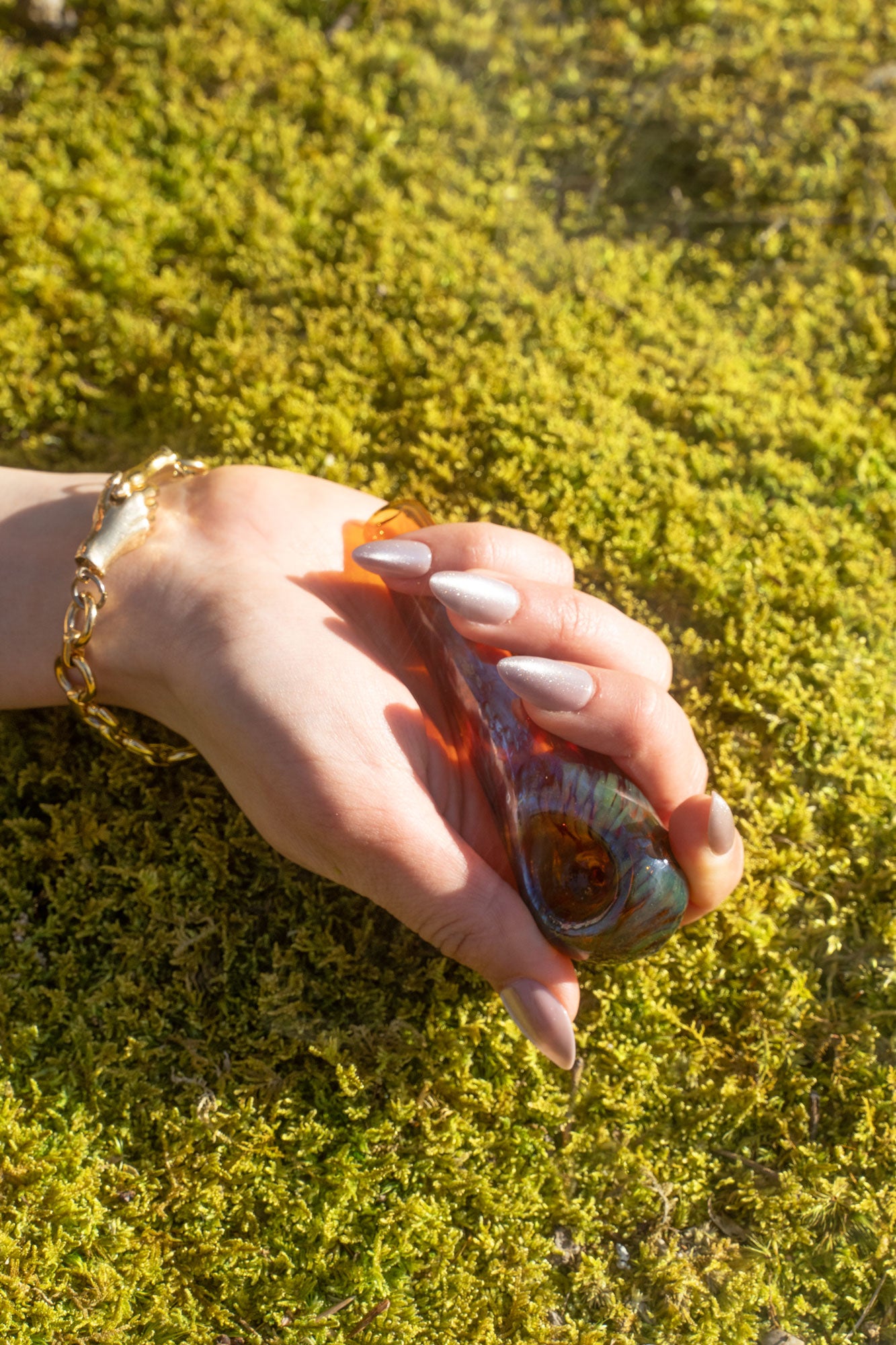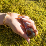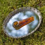 A limited edition piece. Featuring a teardrop shape with a swirl of translucent sage green and transparent amber glass, and a light touch of fumed iridescence.